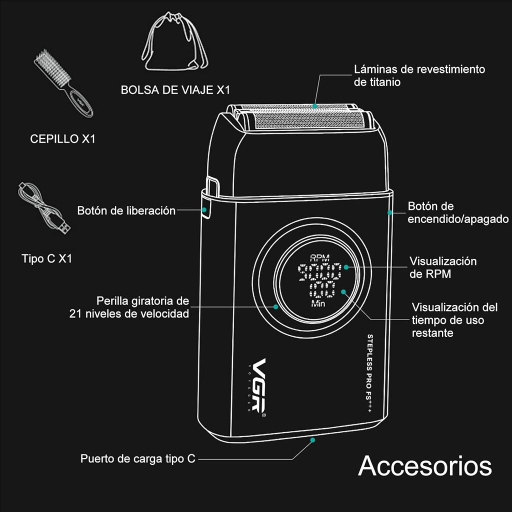 | Componentes incluidos | Afeitadora de aluminio, Cable de carga USB, Cable de carga USB., Cepillo de limpieza, Funda protectora, Funda protectora. |