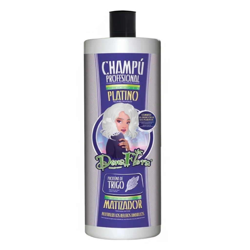 Dona Flora - Champú Matizador Platino - Neutraliza Tonos Amarillos y Naranjas - Pigmentos Violeta - Hidrata y Fortalece -Ideal para Cabellos Rubios, Decolorados o Grises - 1000ml