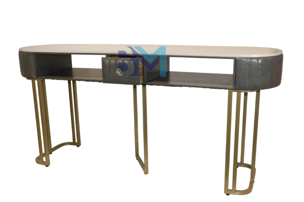 Mesa de manicura doble en terciopelo gris con tope de piedra tipo mármol