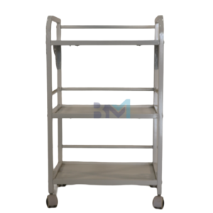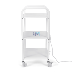 Carrito auxiliar de metal en color blanco con tres estanterías ideal para centros de estéticas y belleza.
