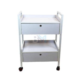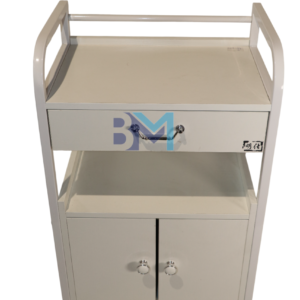 Carrito de manicura y pedicura con bandeja auxiliar con subdivisiones, cojín y tres cajones deslizantes, diseñado especialmente para uso profesional. Sus ruedas giratorias permiten su movilidad fácilmente.