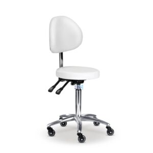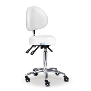 Taburete de estética disponible en color blanco con respaldo equipado un pistón de gas para ajustar la altura del asiento.
