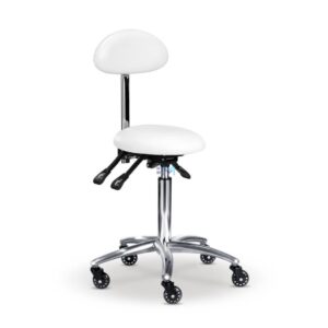 Taburete de estética blanco con respaldo equipado con tres pistones de gas para ajustar la altura, la inclinación del respaldo y la inclinación del asiento en forma de sillín.