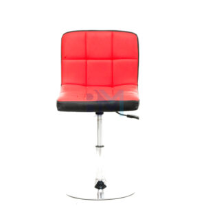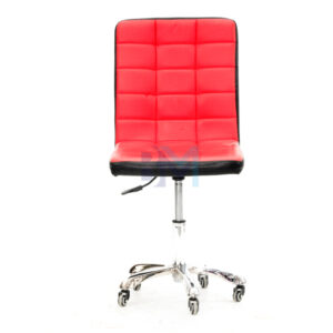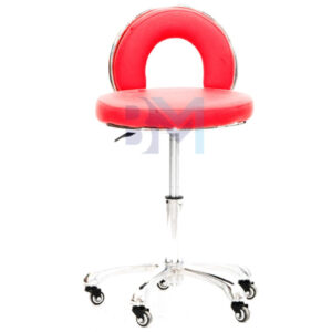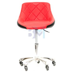 Taburete con respaldo en polipiel color rojo , con base de ruedas o base fija con hidráulico y altura ajustable. Diseño con detalle plateado en los bordes, asiento ergonómico y acolchado de grosor especial para una excelente comodidad y confort.