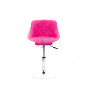 Taburete con respaldo en polipiel fucsia con blanco, con base de ruedas en acero. Su silueta sencilla y su amplio respaldo lo hacen muy cómodo y moderno.