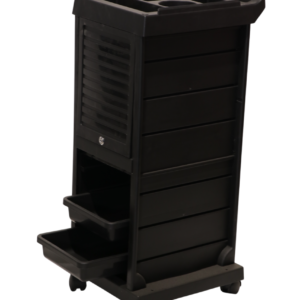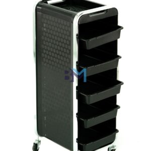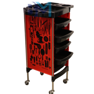 Carrito auxiliar de barbería y peluquería con 5 bandejas extraíbles. La parte superior permite colocar el material del trabajo de uso del profesional. Montaje fácil y rápido sin necesidad de herramientas.