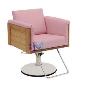Silla de peluquería color rosa y madera con diseño clásico, fabricada en polipiel de PVC de alta calidad retardante al fuego. Apoyabrazos, asiento ergonómico para una mayor comodidad y confort.