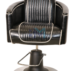 Silla para peluquerías fabricada en polipiel, con un estilo clásico y apoyabrazos recubiertos de color negro, ofreciendo una mayor comodidad gracias a su asiento ergonómico.