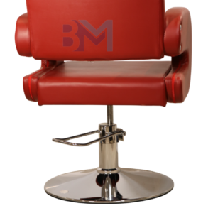 Silla de peluquería color rojo con diseño clásico, fabricada en polipiel de PVC de alta calidad retardante al fuego. Apoyabrazos, asiento ergonómico para una mayor comodidad y confort.