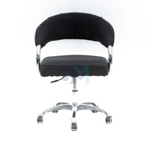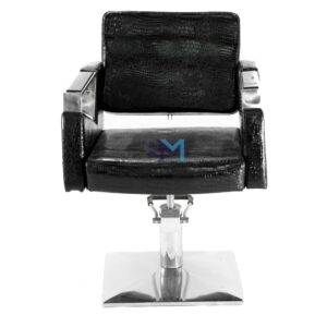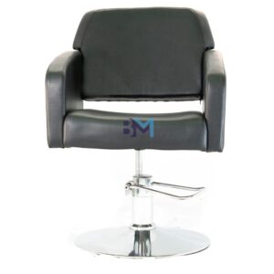 Silla de peluquería color negro con diseño moderno, fabricada en polipiel de PVC de alta calidad retardante al fuego. Interior de PU inyectado con estructura metálica.