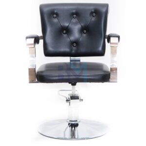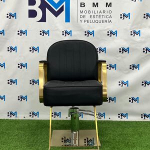 Silla de peluquería color negro con diseño vintage, fabricada en polipiel de PVC de alta calidad retardante al fuego. Interior de PU inyectado con estructura metálica.