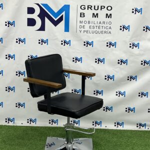 Silla de peluquería en polipiel color negro o marrón con apoyabrazos de madera fabricada en polipiel de PVC de alta calidad retardante al fuego y madera. Asiento ergonómico para una mayor comodidad y confort.