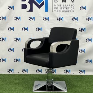 Silla para peluquerías fabricada en polipiel, con un estilo clásico y apoyabrazos recubiertos de color negro, ofreciendo una mayor comodidad gracias a su asiento ergonómico.